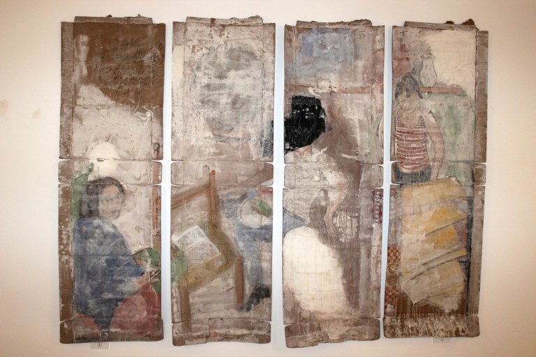 Hablando de la leña, callo el fuego? Materias orgánicas y minerales sobre cartón, 220 x 287 cm, 2013. En exhibición en Obras en Esplendor II, Hotel Esplendor, Montevideo, diciembre de 2013-Marzo de 2014. Detalles: