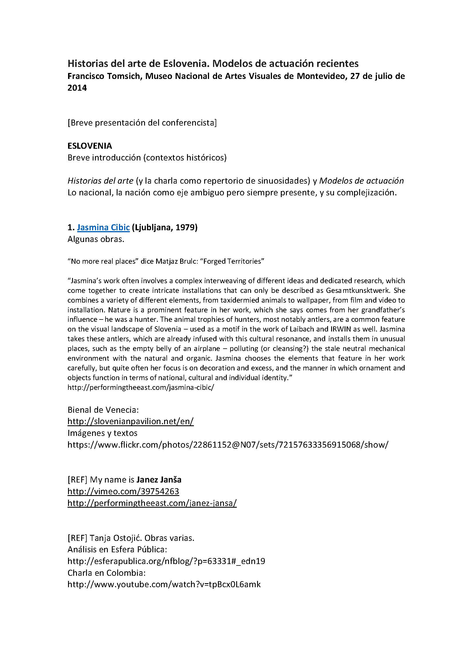 02/12/2014 Historias del arte de Eslovenia. Modelos de actuación recientes. Conferencia de Francisco Tomsich, MNAV, Montevideo, 26 de julio de 2014_Página_1