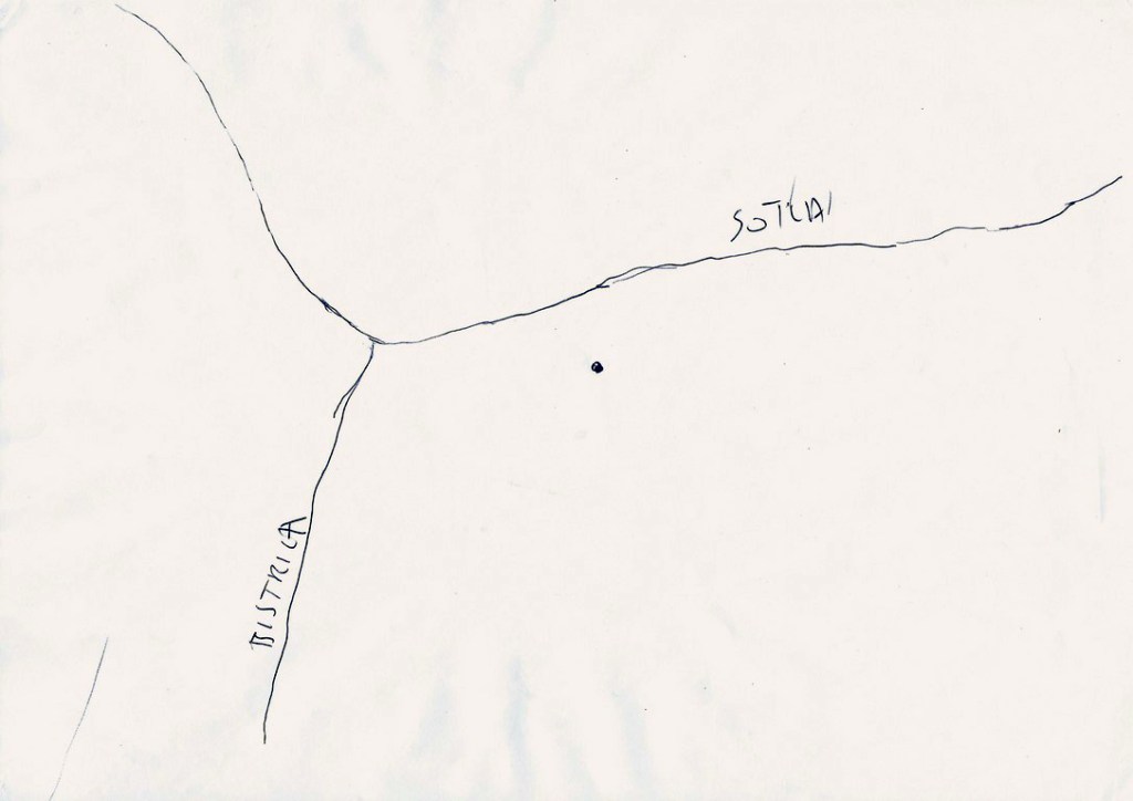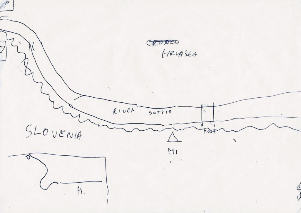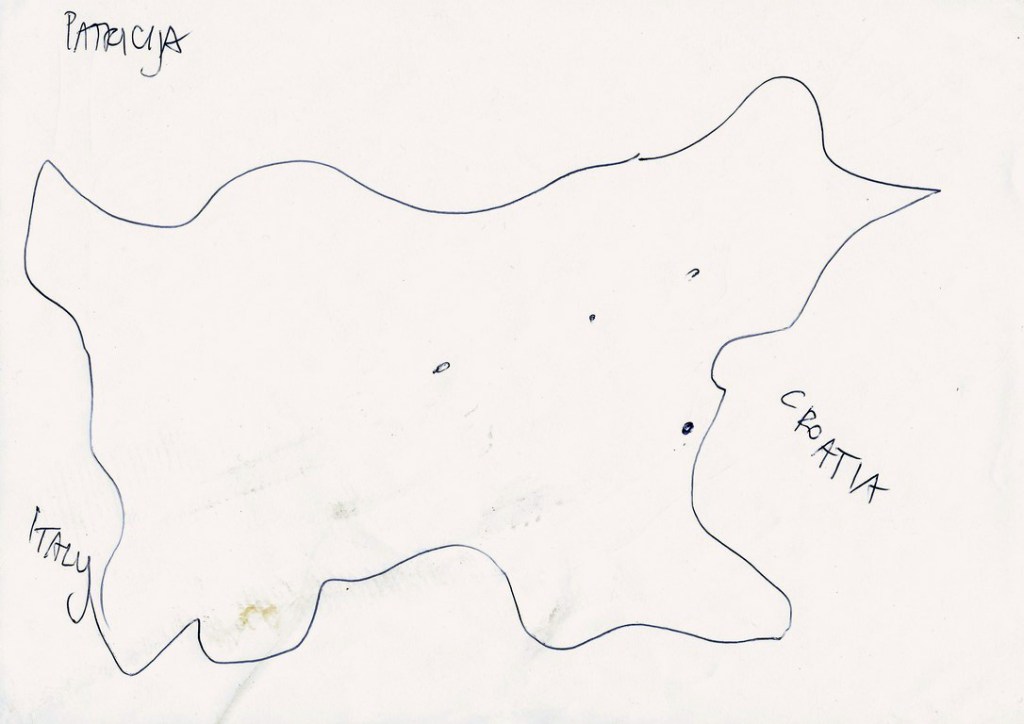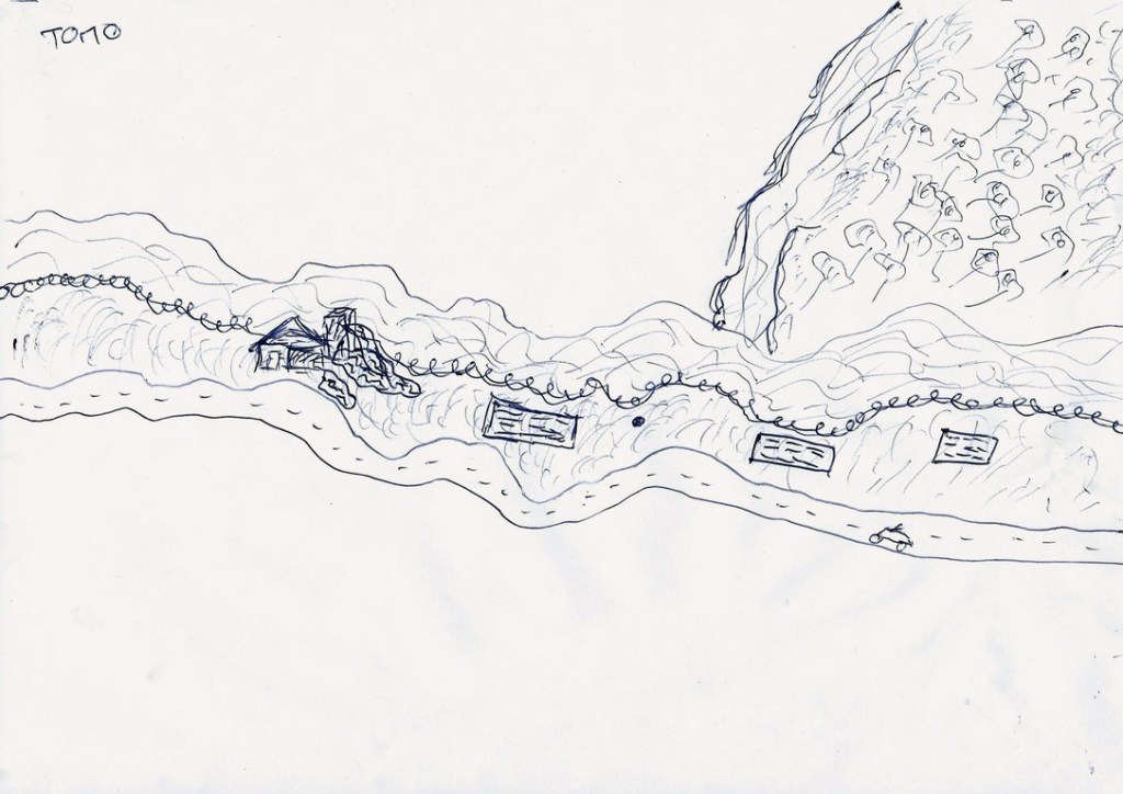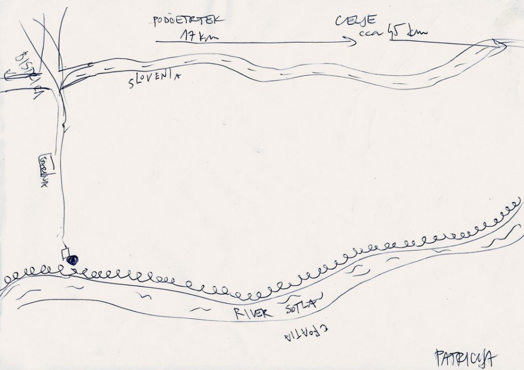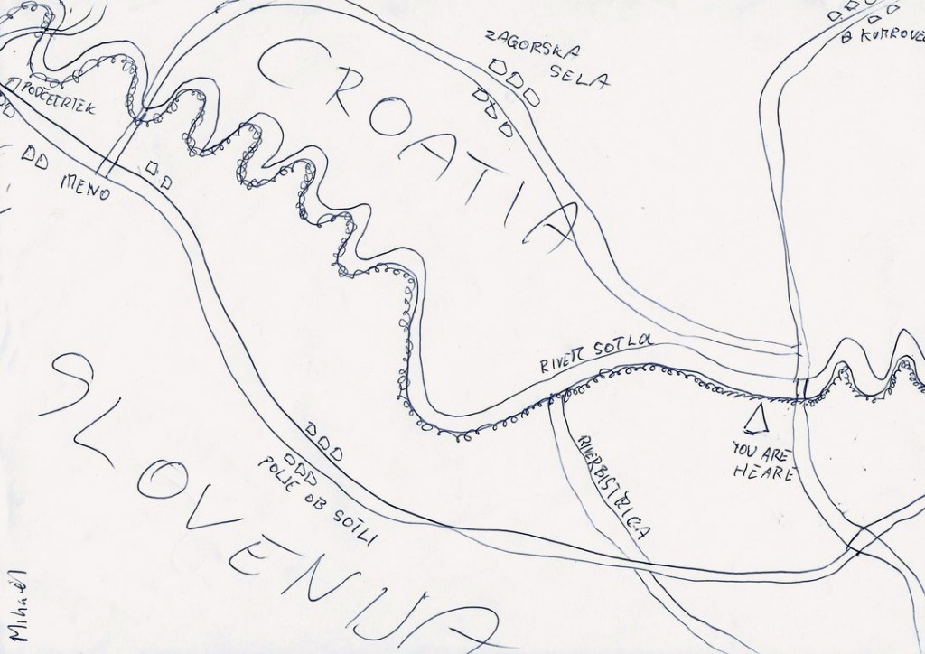Defence camp, at the very border between Slovenia and Croatia, June, 2016. An international gathering of refugees, activists and social workers on both sides of the razor-blade fence dividing Slovenia and Croatia. This expensive and absurd fence, specially dangerous for the animals, was installed by the Slovenian government when Hungary closed the doors to the massive movement of refugees coming from Greece through Macedonia. A highly controversial unilateral decision, the line of the fence follows the course of some of the most important Slovenian/Croatian rivers. The first day of the camp I asked some local assistants (Patricija, Brigita, Tomo, Valentin, Sašo, Terne, Miha) to draw a map in order to represent their places of living and how they are connected in relation to the nearby converging rivers Sotla and Bistrica. This basic drawing exercise evidenced the strong symbolic presence of the fence, and brought some stories and discussions facing the fact that the border between the two countries, now so well and apparently definitively fixed by the fence, was not always so clear, not only to local people but to the authorities themselves. The absurdity of this “new” border became more obvious when some locals told stories about people who have now their house in one country and their farms or fields in another, and the daily bureaucracy of border control. The strong economic and social impact of the fence for local people, which is not very often analysed or referred to by main media, came to the foreground. The drawings were stapled on a board and publicly displayed during the festival.
