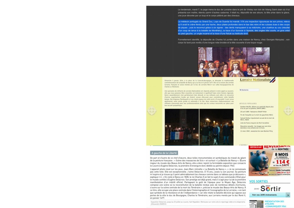 1The Battle of Nancy (5.1.1477) has a considerable importance for the history of France in general and of the Duchy of Lorraine in particular, and it has a strong presence in visual arts and literature, as well as in nationalist and revisionist discourses. I make use of some of these references and stories and manipulate them together with my own iconography in order to approach history painting tradition through alternative narratives and a rare mixture of popular Latin-American (an)arquitecture and allegorical thought.