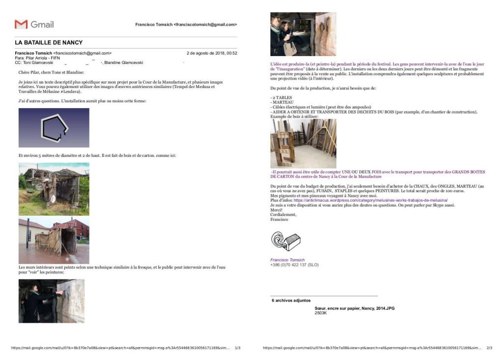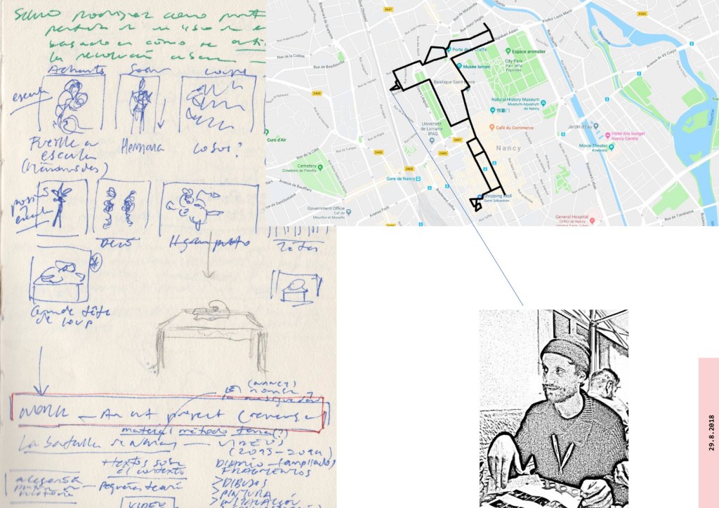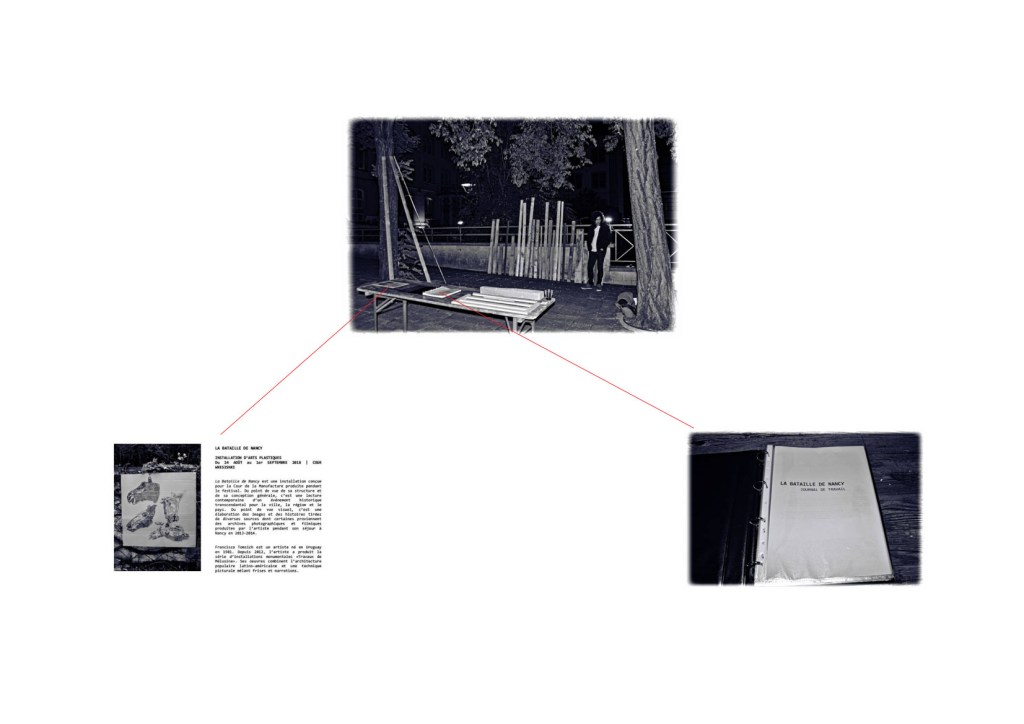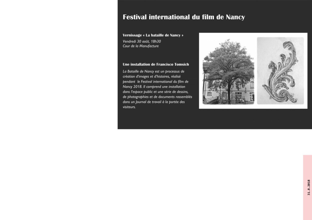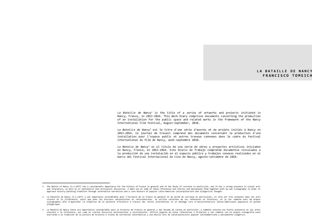 La Bataille de Nancy1 is the title of a series of artworks and projects initiated in Nancy, France, in 2013-2014. This Work Diary comprises documents concerning the production of an installation for the public space and related works in the framework of the Nancy International Film Festival, August-September, 2018. La Bataille de Nancy2 est le titre d’une série d’œuvres et de projets initiés à Nancy en 2013-2014. Ce journal de travail comprend des documents concernant la production d’une installation pour l’espace public et autres travaux connexes dans le cadre du Festival international du film de Nancy, août-septembre 2018. La Batalla de Nancy3 es el título de una serie de obras y proyectos artísticos iniciados en Nancy, France, en 2013-2014. Este Diario de Trabajo comprende documentos vinculados a la producción de una instalación en el espacio público y trabajos conexos realizados en el marco del Festival Internacional de Cine de Nancy, agosto-setiembre de 2018.