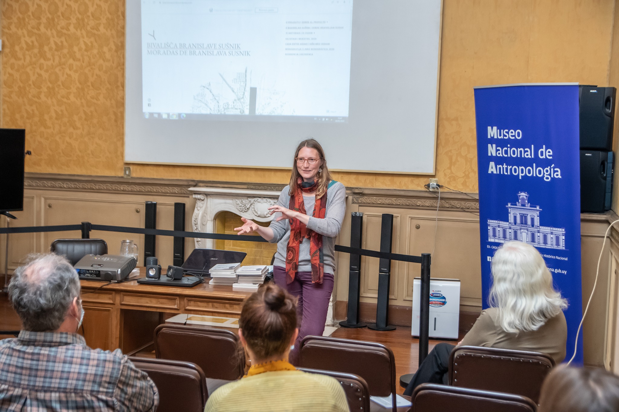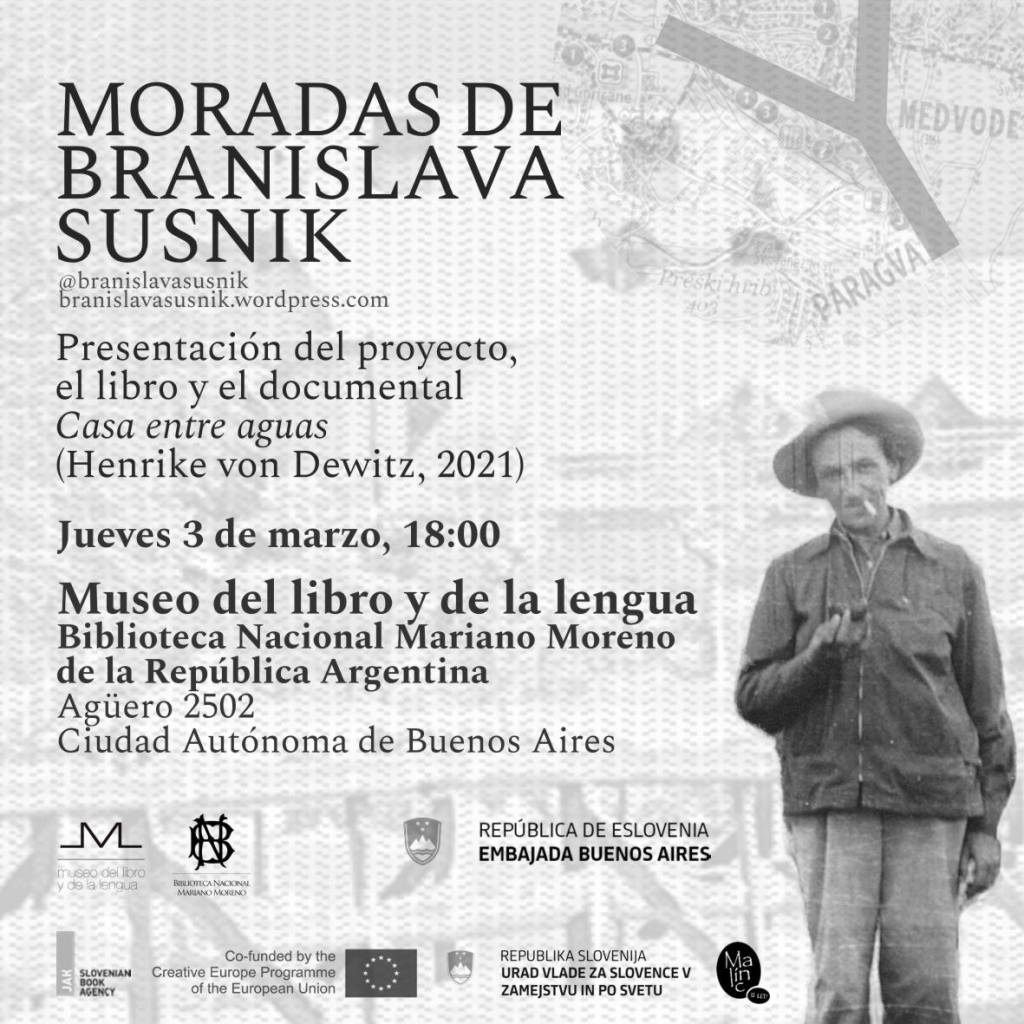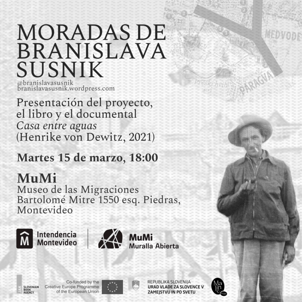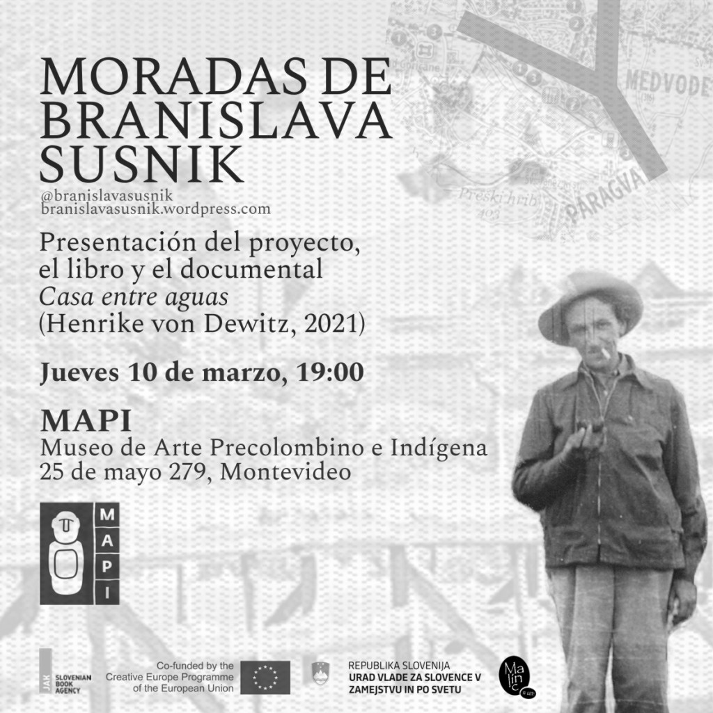 In March 2022, the Moradas de Branislava Susnik|Bivališča Branislave Sušnik project was on tour in Montevideo and Buenos Aires, presenting its book and the film Hiša med vodami/Casa entre aguas (Henrike von Dewitz, 2021) in different institutions and contexts. On 16.3.2022, the radio program Serendipia broadcasted an interview with Henrike von Dewitz and Francisco Tomsich. (Radio Cultura, Uruguay) on the project. Organized by Malinc publishing house with the support of many institutions and individuals in Slovenia, Uruguay and Argentina.