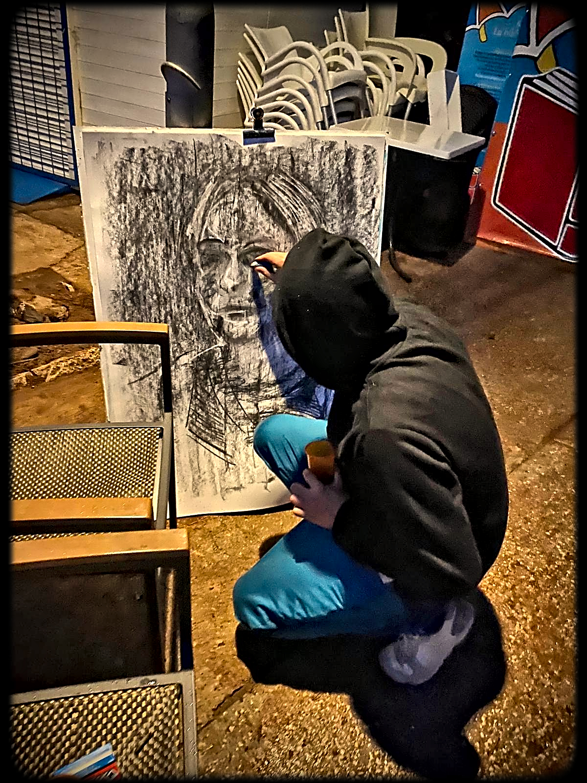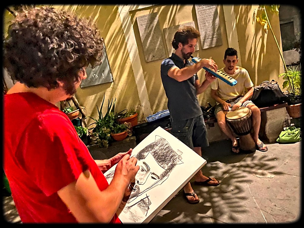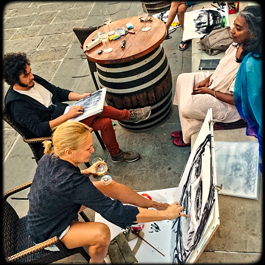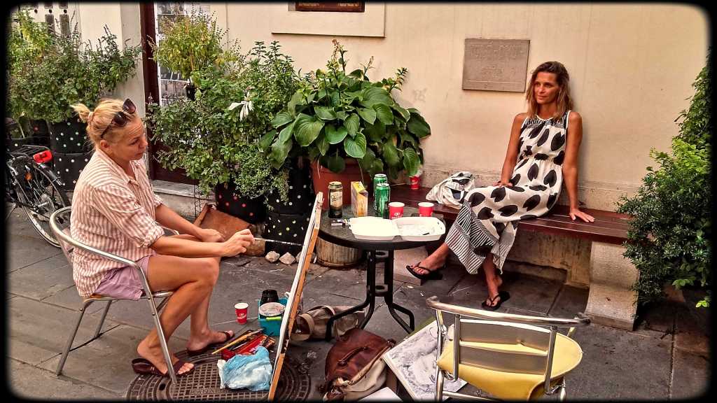 This exhibition of street portraits displays a series of skillful and fast portraiture techniques that two experienced painters have developed through their meetings on the streets of Izola. Each of them faces the same motif with a distinctive and recognizable style, through a different eye and differently trained and experienced hand. These artists were risen in two very different countries and come from distinct cultures, but both of them are currently living and creating in Izola. Last August, they decided to start meeting to make portraits on the streets, without any utilitarian backgrounds and for their own sake. The project is devoted to a fascination with the concept of meeting, face to face, passers-by, friends or strangers, and capture the moment of the encounter, the flow of thought and its simultaneous transience. Here, they introduce to us some life moments of random persons caught by chance in some of those encounters.