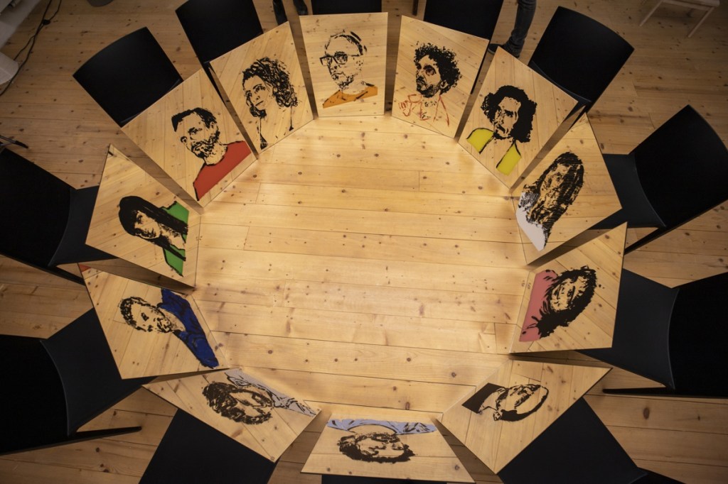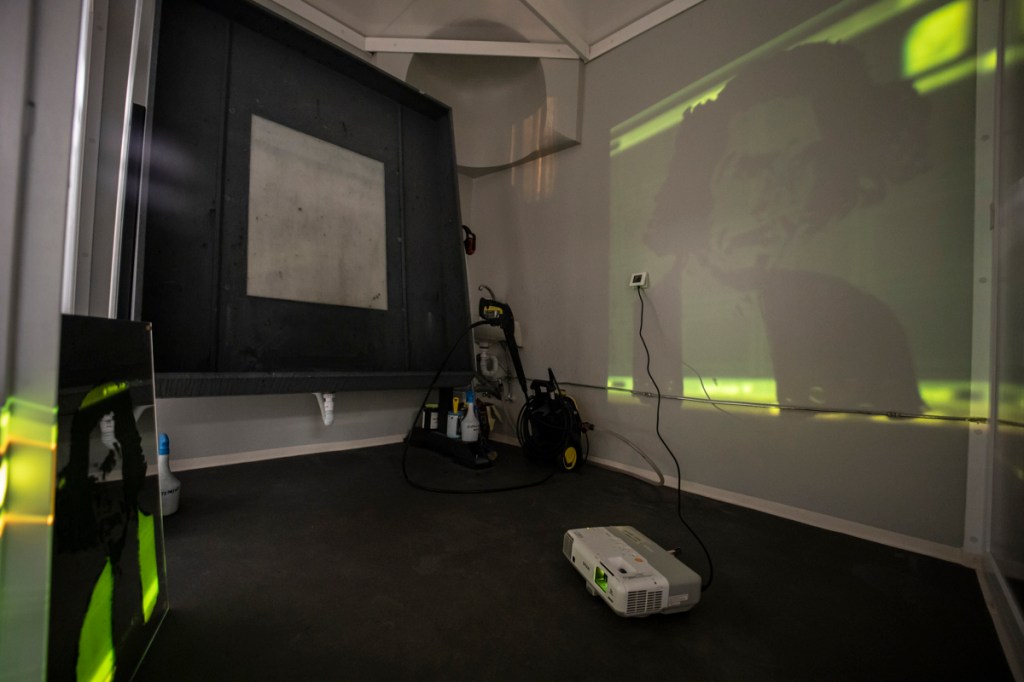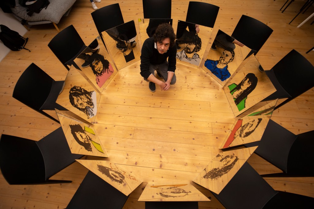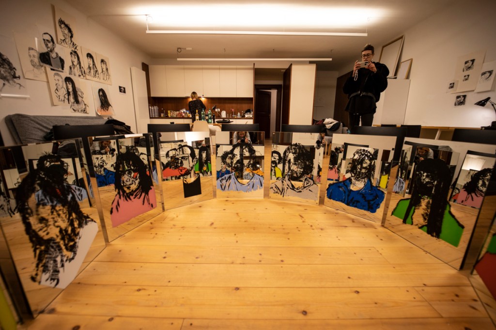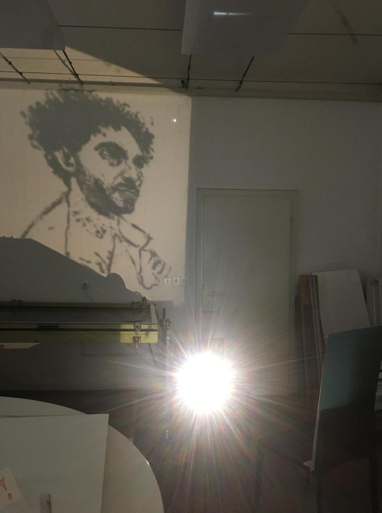 Starting on 1.11.2022, I invited cca. 30 friends who live far away to pose for a portrait via Zoom, Google Meet, WhatsApp, Viber. All these poses replicated the same position. The sessions were projected on a wall, and coal and acrylic-based drawings were produced live during the lenght of the pose. Editions of prints on paper and mirror were done upon a selection of works who succeed in being acceptable drawings and good portraits at the same time. The mirrors, at the end, are exhibited as supports and sources of light projections and multi-layered exercises on reflection.