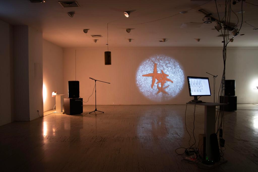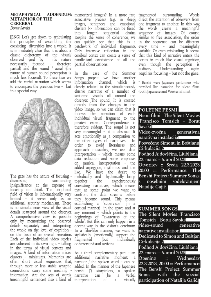 Summer Songs, the second project of The Silent Movies duo, is an artistic environment comprising a series of sources of visual, sound and verbal information mutually dependent on each other. It functions as an never-ending concert, in which a video installation composed by a series of recent silent films made by Francisco Tomsich provide rough material, red threads and digital data to a sound ecosystem developed through an original software and materialized using specifically-made sound sources (-> vibration loudspeakers) by Borut Savski. It seems that the first project from 2020 entitled Elegy was inspirational enough to lead th participating authors to Summer Songs.
