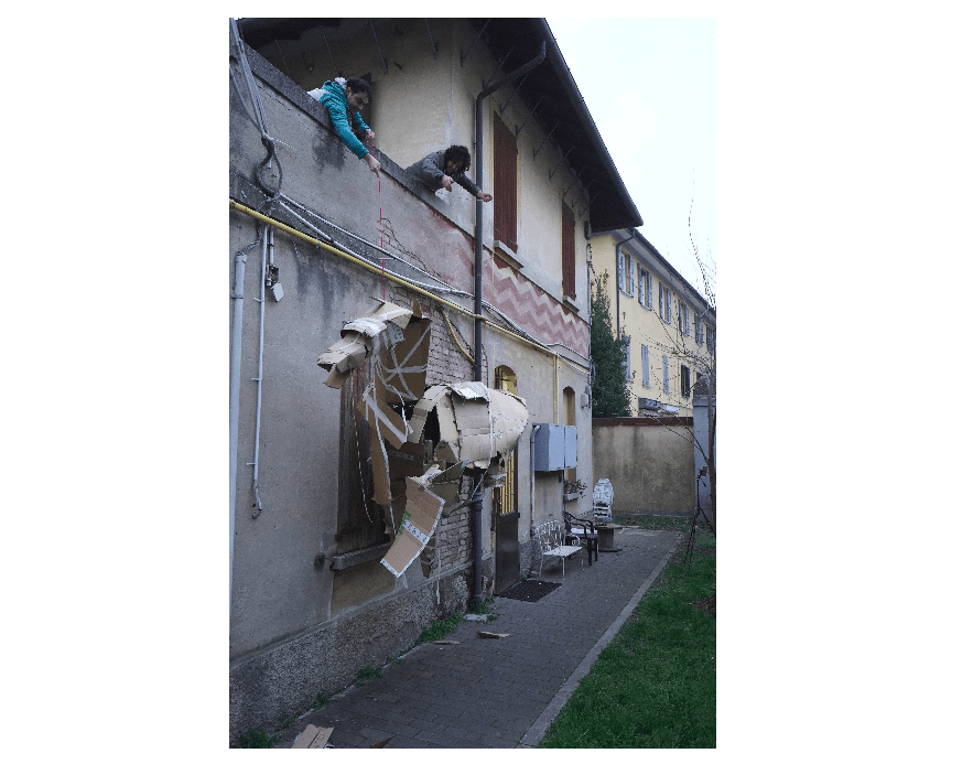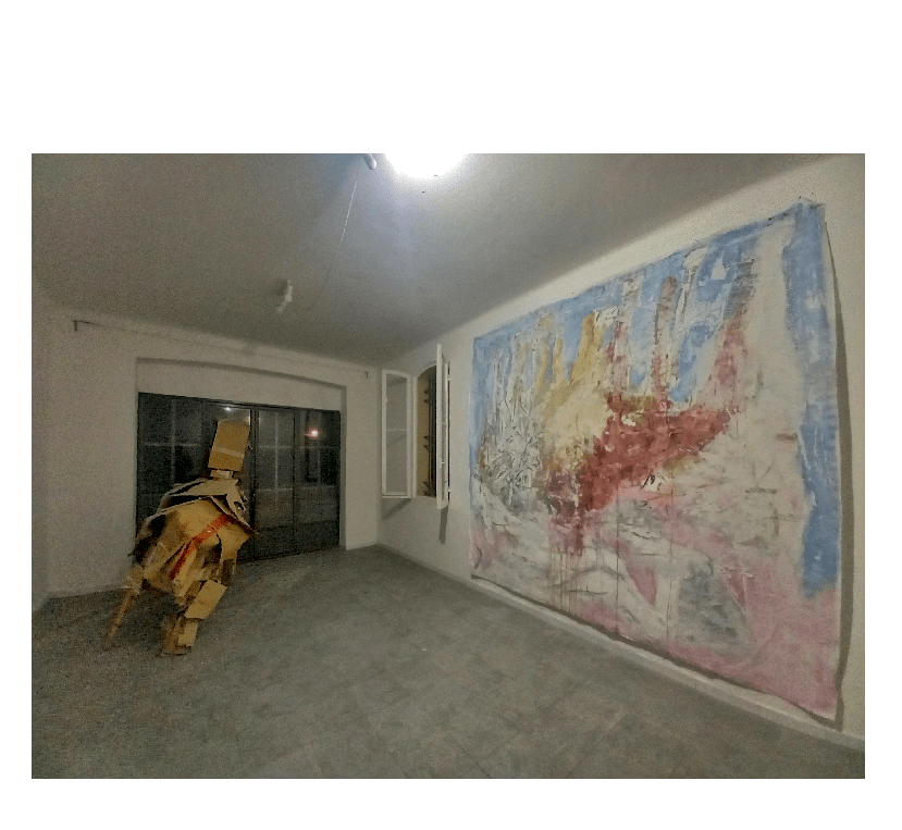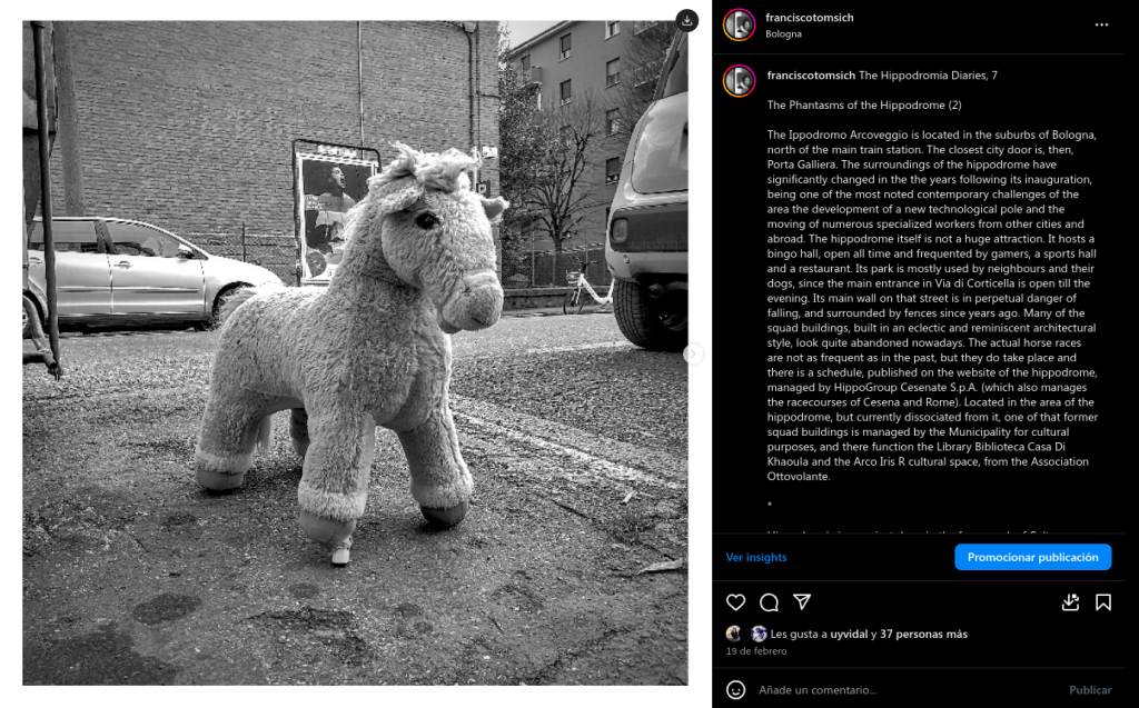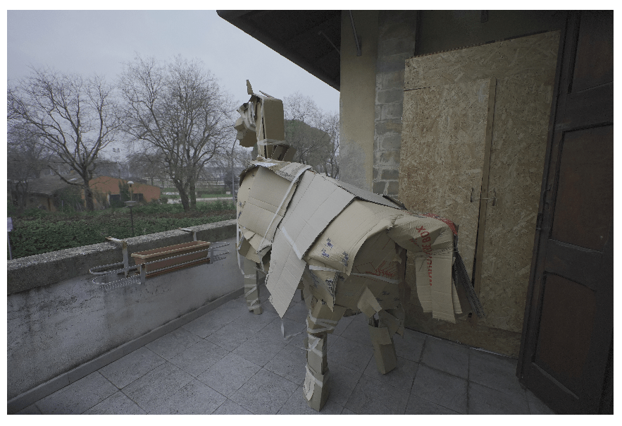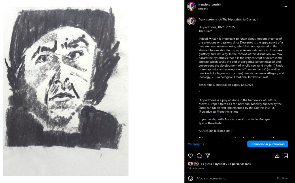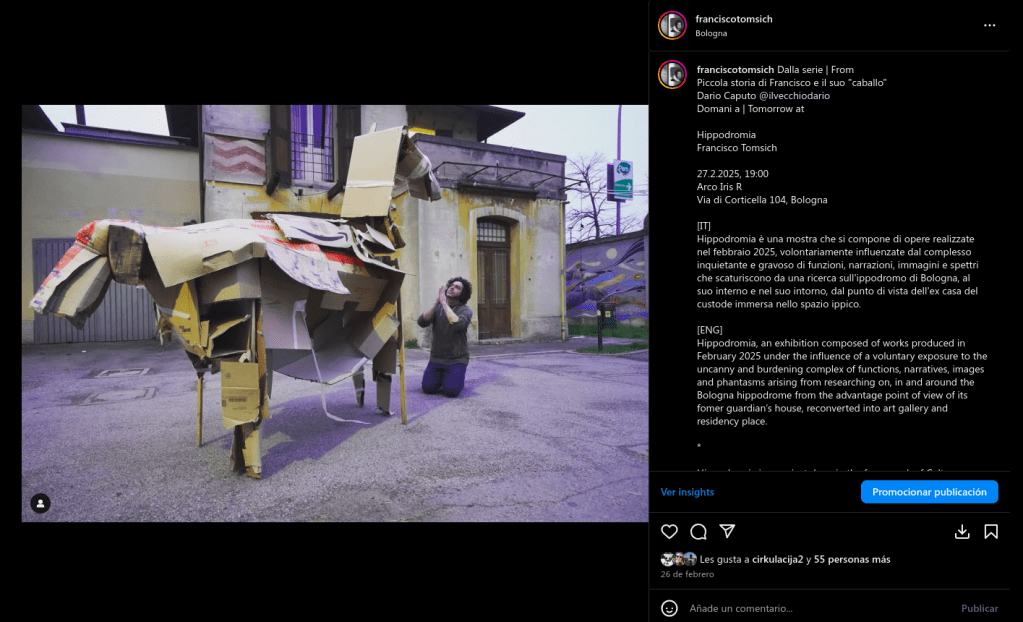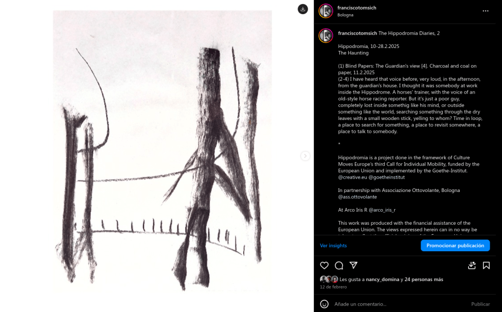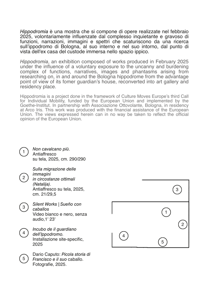 Hippodromia, an exhibition composed of works produced in February 2025 under the influence of a voluntary exposure to the uncanny and burdening complex of functions, narratives, images and phantasms arising from researching on, in and around the Bologna hippodrome from the advantage point of view of its fomer guardian’s house, reconverted into art gallery and residency place.