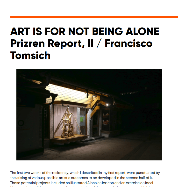 Reflections on Residence and ART IS FOR NOT BEING ALONE, Prizren Report II, two texts about the experience of working in Prizren, Kosovo in April-May 2025 at Lumbardhi Foundation in the framework of Operation Nova: Re-imagining Cultural Spaces in a New European Context.