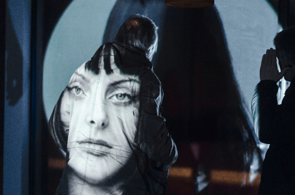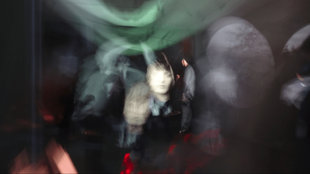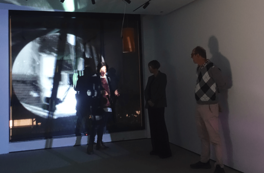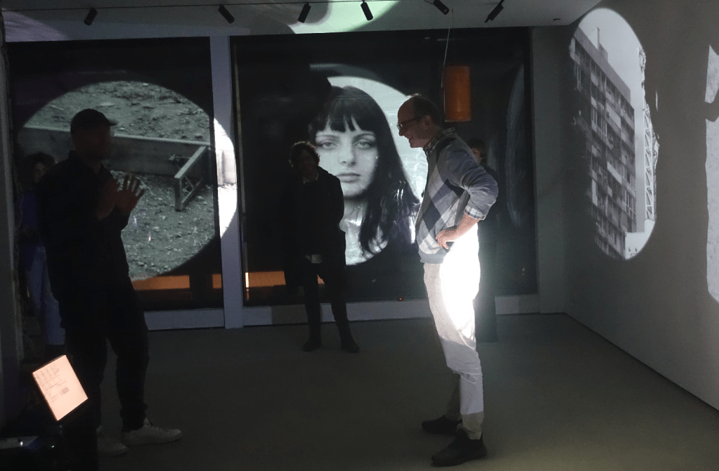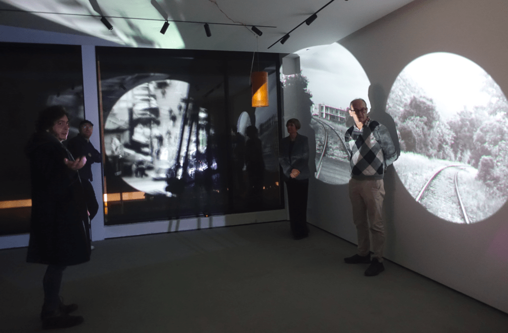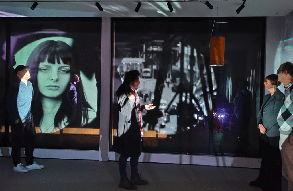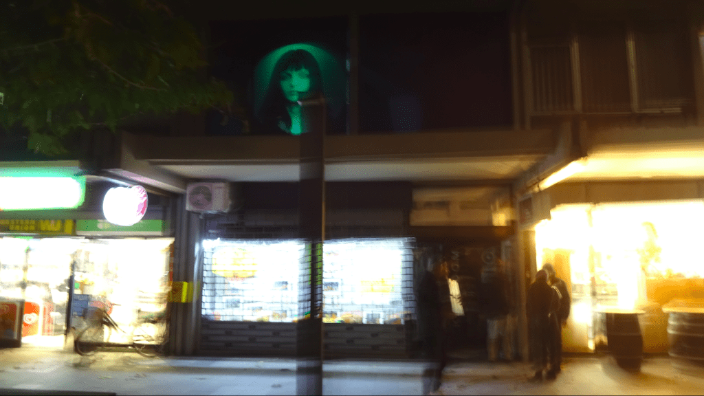 Therefore, each video installation put into dialogue fragments of travelogues made in different cities where the artist has been focusing in the paradoxes of urban life: Nova Gorica, Skopje, München, Velenje, Murska Sobota, Novi Sad, Prizren. The work made upon footage produced in Nova Gorica in 2025, for instance (The Unregistered Meeting) is built upon an erotic fantasy of surrealistic pedigree: the secret encounter of two anonymous runners, witnessed by mannequins and surrounded by border landscapes and party scenes which carry a big sense of distress, maybe associated to the sniper’s view-like shoots which also appear in a work produced in Prizren in April 2025, Let’s Take a Walk! I Will Tell You a Story of Those Who Died, and We Can Talk About My Art. It was made in collaboration with a local young artist, Karanfile Haxhi, who performs silently, in front of the camera, an inner walk through the city, a story about someone she knows who recently died, and a conversation about her art, while segments of Tomsich’s video diaries (made before the performance’s shooting) try to revoke, illustrate, react or mimic her unreachable discourse. Another video on display, Haikus, Silences and Free Verses from Gropius van der Rohe (made specifically for this show but produced in 2022), is an angry exploration of a high-tech pole in München in between Walter Gropius and Mies van der Rohe streets, where something happens (but not what is supposed to be in the clean urban and architectural project).