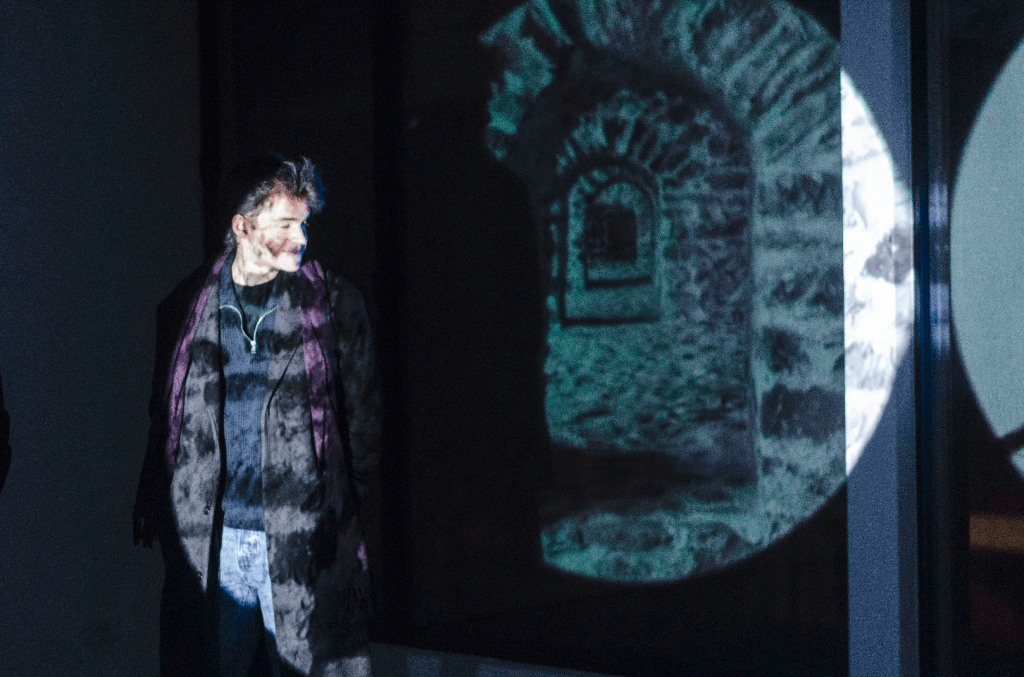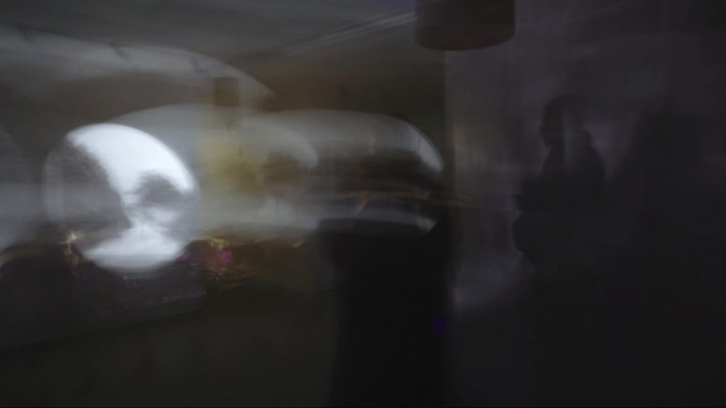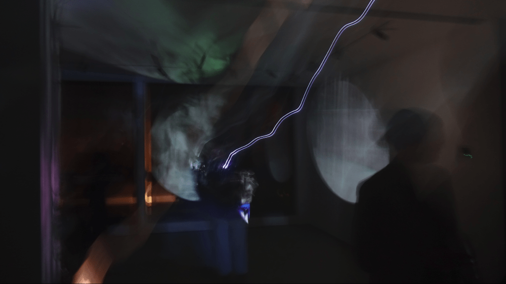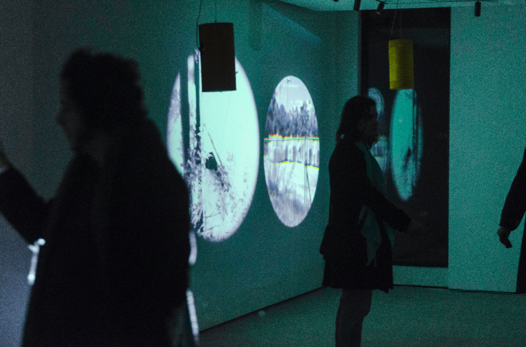 on the nature of subtle sound resonances. An additional source of dynamics is a sensor that detects movement in the space and participates in sound changes. Four-channel video projection and six-channel sound.