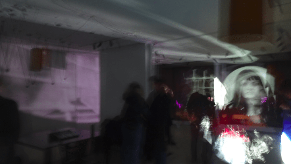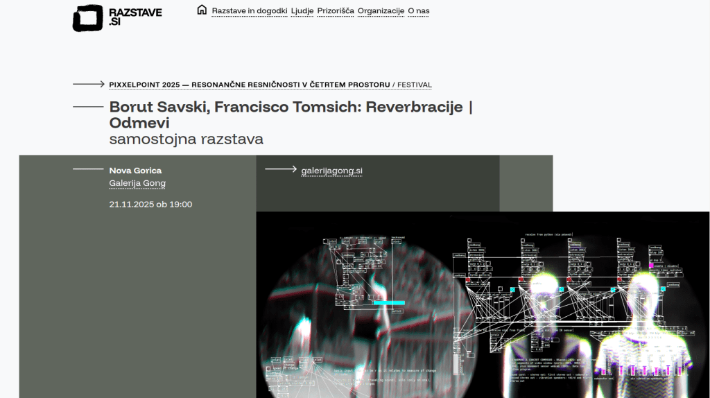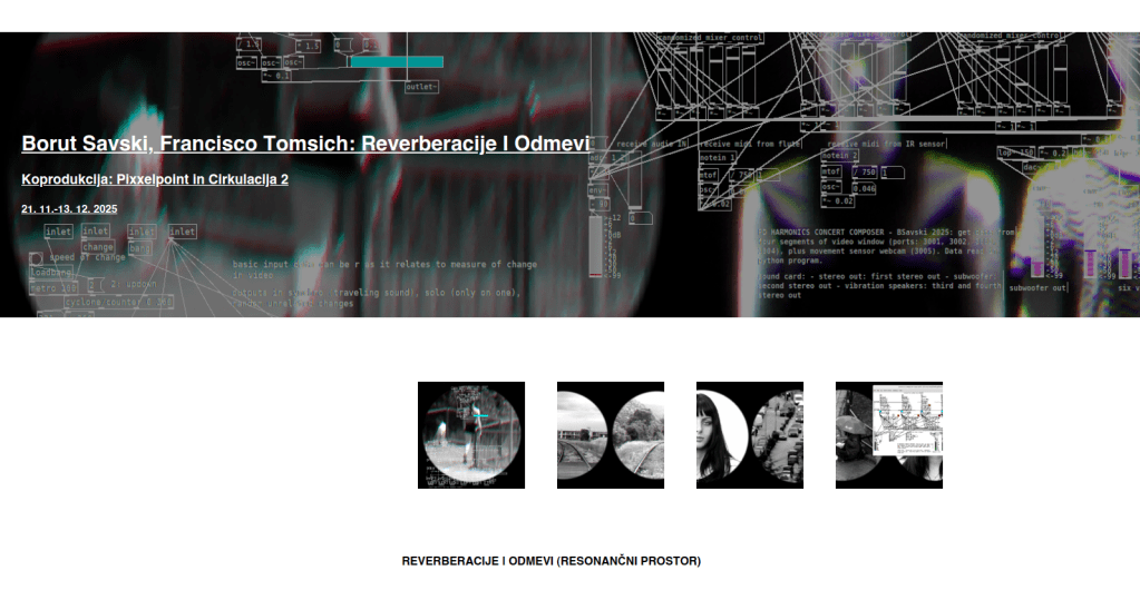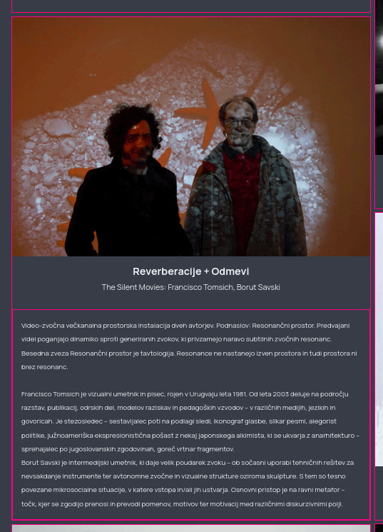 Reverberations | Echoes (Resonant Space) is the third exhibition of The Silent Movies duo (Borut Savski + Francisco Tomsich). Their collaboration in the joint creation of complex ecosystems of interrelated sound and video devices and never ending concerts was sketched at the exhibition Elegy (Francisco Tomsich, Cirkulacija 2, Ljubljana, 2020) and significantly developed for the project Summer Songs (Cirkulacija 2, 2023). It was further shaped for the show After the Party (Alkatraz Gallery, Ljubljana, 2024).