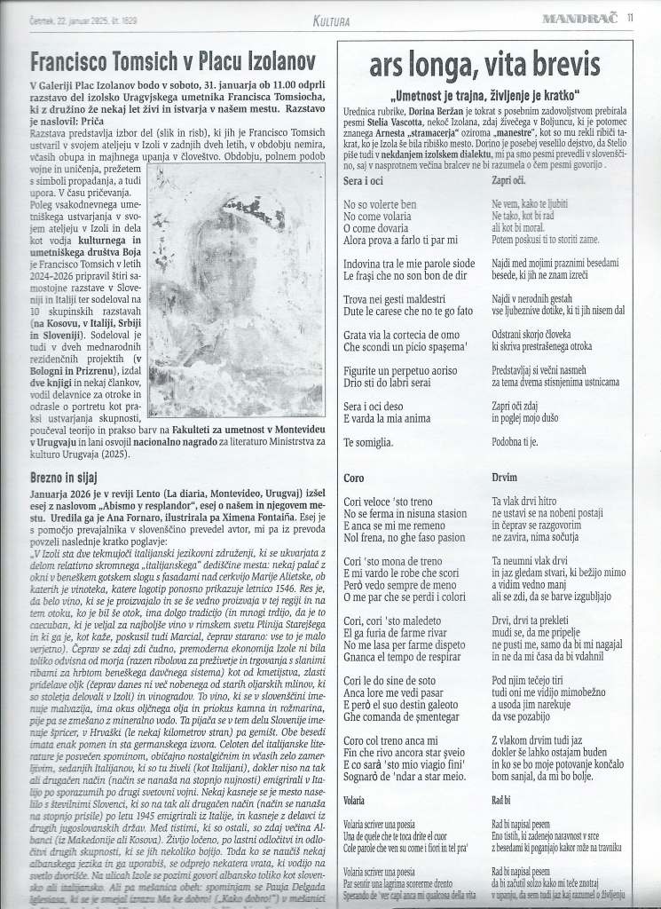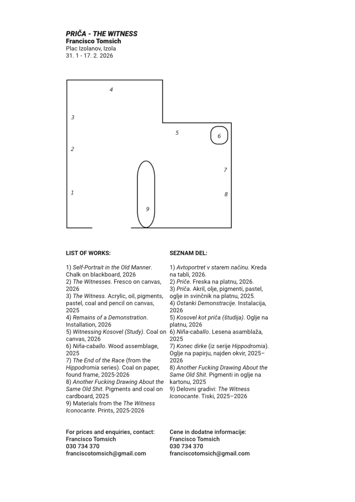 This exhibition presents a selection of works produced by Francisco Tomsich in his studio in Izola in the last two years, a period of turmoil, sometimes despair and little hope in humanity. A period populated by images of war and destruction, traversed by symbols of decay but also of resistance. A time of witnessing.