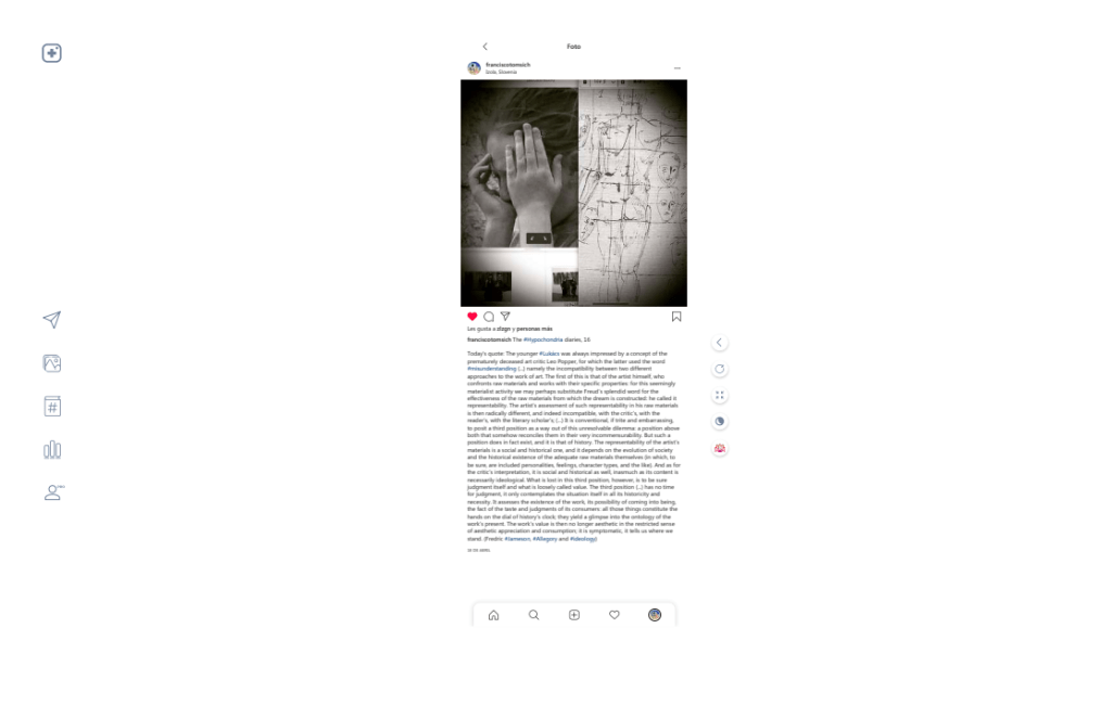 Some of these books are textual & visual diaries of working processes in certain coordinates of place and time (kairotopes), usually related to an exhibition or series of exhibitions, like Diario de Il Guardiano dell’Ippodromo (2025). The Hypochondria Diaries (2021) compiles Instagram posts published during the making of Hypochondria (Insula Gallery, Izola), while La Bataille de Nancy. Journal de Travail (2018) and Templo de Medusa | Tempel der Medusa (2014) deal with two diffferent apparitions of the Melusine’s Works series. Other editions are documents of long-term research projects made in association, as in Idea Vilariño: Ljubezenske pesmi (Ljubljana, Malinc, 2023), Bivališča Branislave Sušnik | Moradas de Branislava Susnik (Medvode: Malinc, 2020), Sonetos a dos (written together with Horacio Cavallo, Montevideo: Trilce, 2009) or the series of six books + multimedia publications from Transposed Study for a Common Portrait (TDUEPURC, Montevideo and Porto Alegre, 2008 – 2012): TDUEPURC #6 TAMBORES (TDUEPURC & 1st Montevideo Biennial, Montevideo, 2012); TDUEPURC #5 FUNSA (TDUEPURC & Goethe Institut, Montevideo, 2011); TDUEPURC #4 DE CORRALES A TRANQUERAS (TDUEPURC & Ministry of Education and Culture, Montevideo, 2010); TDUEPURC #3 RIOZINHO (TDUEPURC & 7th MERCOSUL Biennial, Porto Alegre, Brazil, 2009); TDUEPURC #2 CONCHILLAS (TDUEPURC & Plataforma, Montevideo, 2009) and TDUEPURC #1 LA CORONILLA (TDUEPURC & Ministry of Education and Culture of Uruguay, Montevideo, 2008).